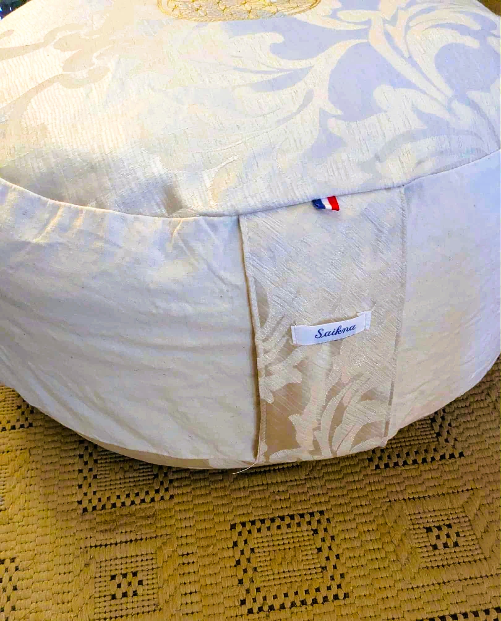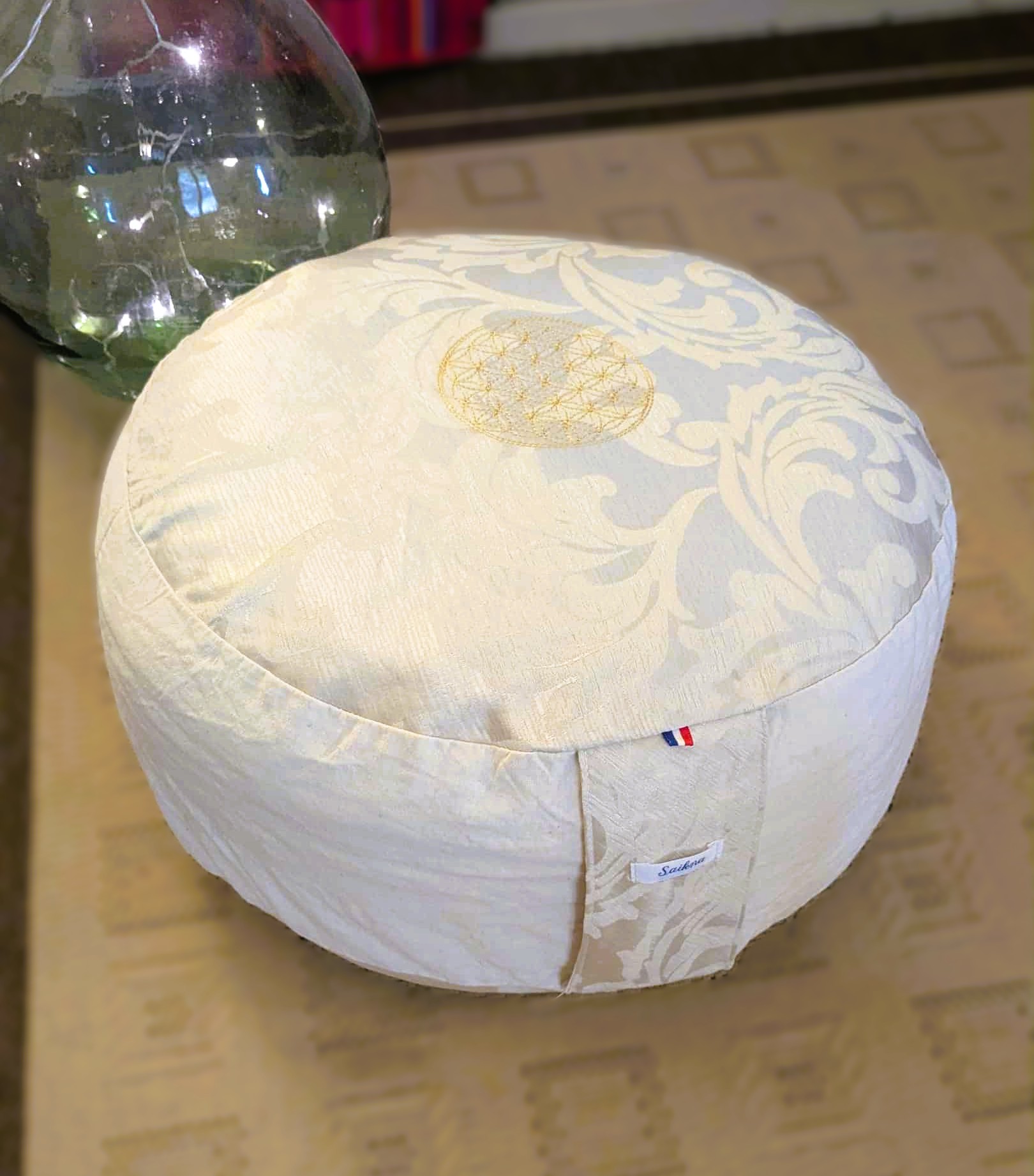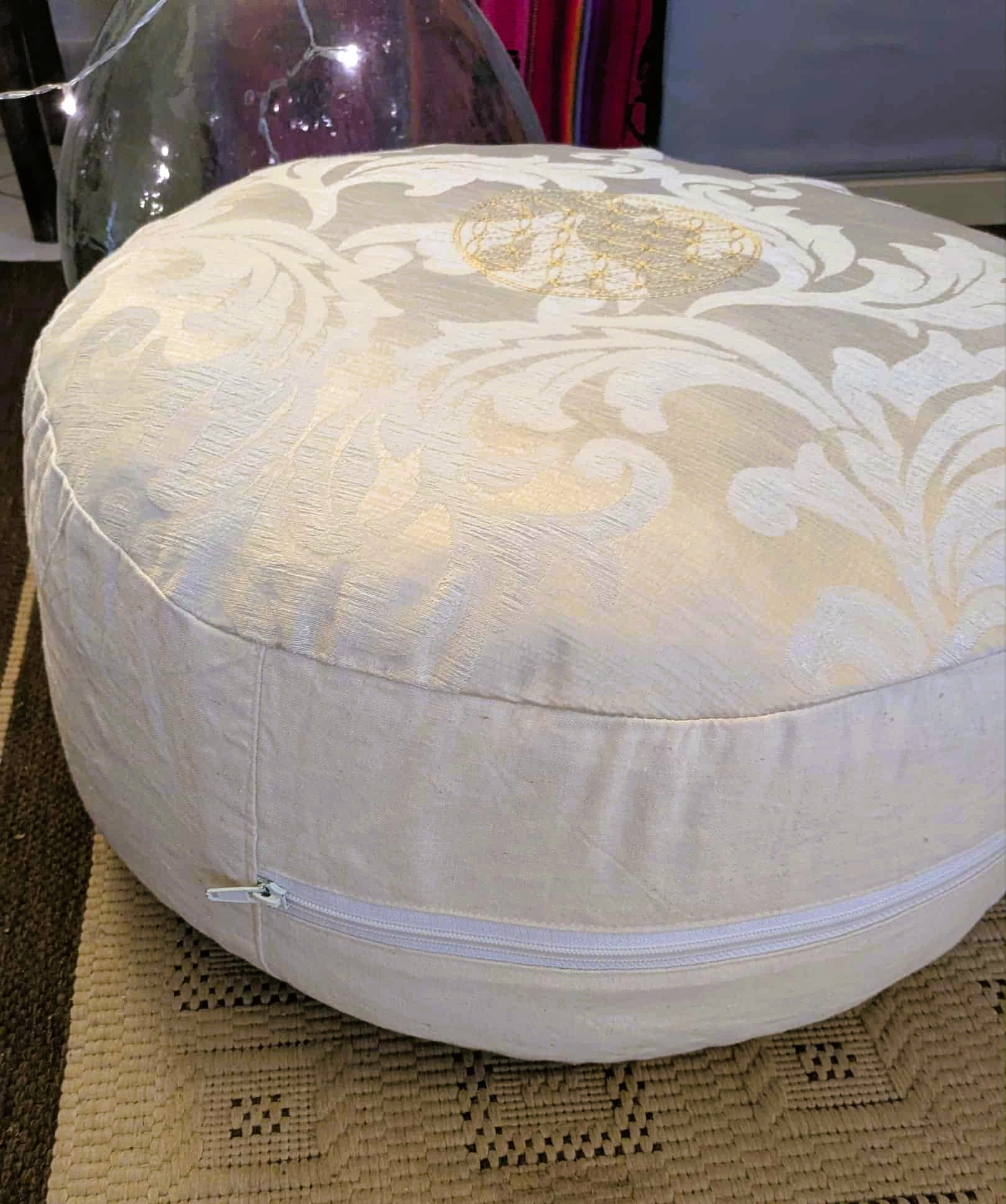 Ce coussin est conçu comme un objet de pratique durable et singulier. Le tissu est entièrement upcyclé, réalisé dans une chute de tissu d’ameublement, imprimé florale. La Fleur de Vie est brodée directement sur la housse, ce qui en fait un élément décoratif et vibratoire, discret mais symboliquement fort.